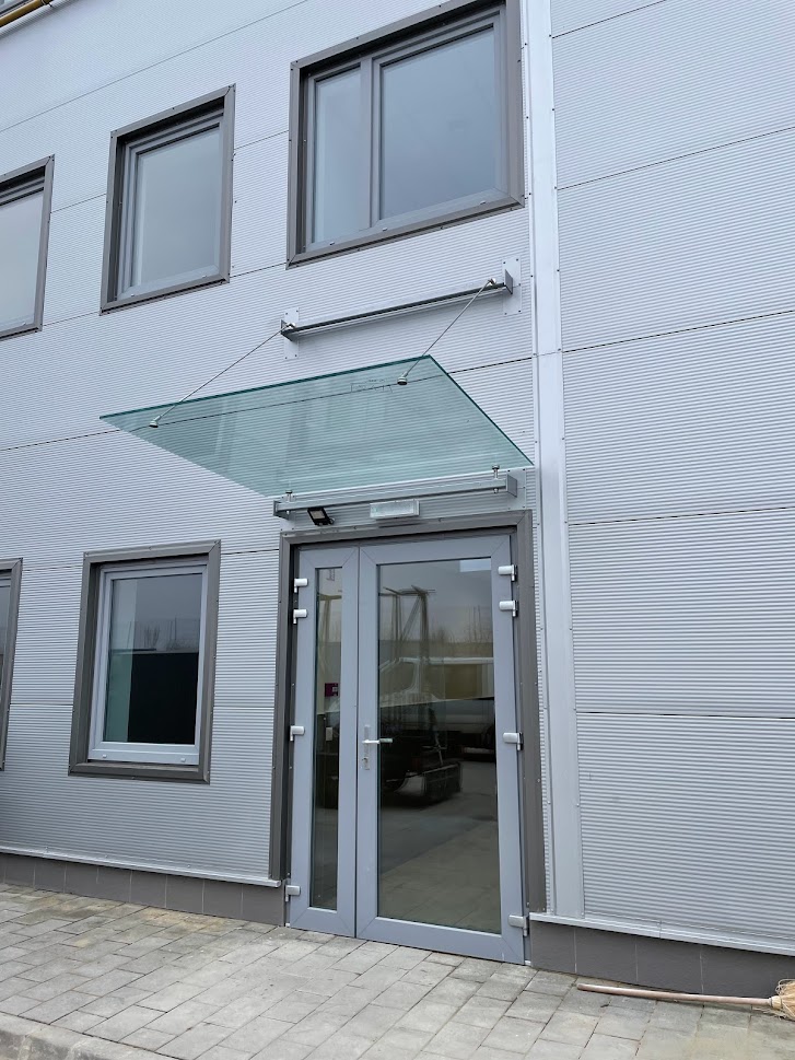 Homlokzati kialakítástól függően, különböző verziójú üveg előtetők. Függesztett pontmegfogással, vagy sávos megfogatással.